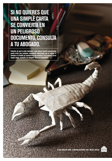 Para Manuel Camas Jimena, decano de los abogados malagueños, la campaña, que el Consejo General de la Abogacía ha distribuido a todos los colegios de abogados ; intenta romper con el tabú que supone acudir a un abogado hasta que ya es demasiado tarde. “La mayoría de la gente acude a nosotros muy tarde. Es un problema, sobre todo, de desconocimiento. No conciben a los abogados como asesores, aunque esa sea, o debiera ser, una de nuestras principales funciones. Como enseña la campaña, en muchos casos, las apariencias engañan y algo que parecía una gran ventaja, acaba convirtiéndose en un problema que se podría haber evitado si se hubiera tenido ayuda legal.”
