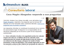 Desde el pasado 1 de mayo, Ceca Magán Abogados se ha hecho cargo del consultorio laboral que publica la versión digital del diario El Mundo. Las preguntas de los lectores serán respondidos por Esteban Ceca Gómez Arevalillo, socio del bufete, y experto en derecho laboral. El consultorio laboral de elmundo.es se realiza a través de un blog donde los lectores del diario pueden enviar sus preguntas a las que responde el socio de Ceca Magán Abogados y se publican todas las respuestas a principios de cada mes. “Es para nuestro equipo y para mi un gran reto, sobre todo muy novedoso. Estamos seguros que, basados en nuestra sólida formación y en la gran experiencia que tenemos en materia laboral, podamos contestar con claridad a los problemas de los lectores de El Mundo,” comenta Esteban Ceca. “Ceca Magán Abogados agradece al diario su confianza en nuestro bufete y en sus abogados,” concluye Esteban Ceca Gómez Arevalillo.