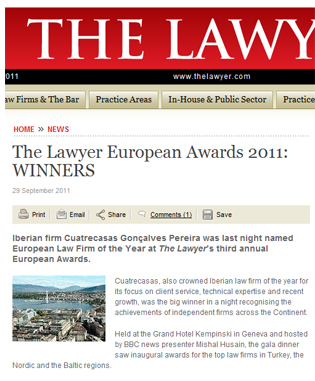 Cuatrecasas, Gonçalves Pereira ha obtenido el reconocimiento como mejor Firma Europea del Año en la tercera edición de los premios de la revista británica The Lawyer. El despacho ha vencido, además, en la categoría de Mejor Firma en la Península Ibérica, por sus servicios jurídicos en España y Portugal. La preocupación por el servicio al cliente, la cualificada técnica y el crecimiento continuado de la firma fueron los argumentos que el jurado de la publicación británica tuvo en cuenta a la hora de otorgar estos premios, en una gala que se celebró anoche en la ciudad de Ginebra. El jurado está compuesto por una veintena de altos representantes del sector jurídico, empresarial y periodístico del Reino Unido. Los European Awards de The Lawyer eligen, en primer lugar, los 15 mejores despachos por zonas geográficas europeas de influencia (excepto Reino Unido) y, de todos ellos, nombra al mejor bufete en todo el Continente. No es la primera vez que este jurado galardona a Cuatrecasas, Gonçalves Pereira: en 2009, ya obtuvo una mención especial como Mejor Firma de Abogados Ibérica de ese año. La socia de Laboral Sonia Cortés fue la encargada anoche en Ginebra de recoger los dos nuevos premios. “Como miembro del Comité Internacional, fue emocionante y todo un honor recoger el premio en nombre del despacho en una gala donde estaba presente toda la abogacía europea”, explica Sonia. Con estas dos nuevas distinciones, Cuatrecasas, Gonçalves Pereira se convierte en la gran vencedora de las firmas jurídicas independientes a lo largo del continente europeo.