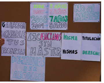 Las pancartas de la cabecera rezaban "Exclusión de los licenciados. ¡Mismo título es igual a mismos derechos!" y "Este master chapucero nos roba nuestro dinero" y los cánticos que no cesaban durante todo el recorrido pidiendo soluciones al ministro de Justicia, Alberto Ruiz-Gallardón, a quien acusaban de no cumplir sus promesas.