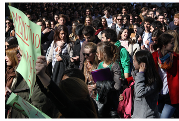 Durante hora y media cerca de mil estudiantes de derecho se manifestaron por las calles de Madrid para exigir su exclusión de los programas de master que la nueva ley de acceso prevé para los futuros abogados.