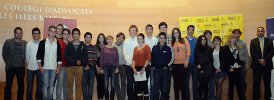 La sala de actos del Ilustre Colegio de Abogados de Baleares (ICAIB) acogió el pasado martes, día 27 de marzo el acto de entrega de premios del concurso “No calles. Actúa”, en cuya primera edición han participado un centenar de alumnos de cuatro centros educativos de la isla que presentaron una veintena de trabajos, y que ha sido organizado por Amnistía Internacional Mallorca, con la colaboración de la Comisión de Derechos Humanos del ICAIB y el patrocinio de Colonya Caixa Pollença. Sensibilizar a los más jóvenes sobre la situación de los derechos humanos en diferentes lugares del mundo es uno de los objetivos de este concurso, dirigido a alumnos de Educación Secundaria y Bachiller y que ha consistido en la elaboración de trabajos por equipos, centrados en la primavera árabe y los derechos humanos. El trabajo “Las mujeres también”, elaborado por el equipo formado por Águeda Ferrà, Jaume Orell, Luis Sánchez y Josep Torrens y tutelado por Fernando Riera Bennàssar, del colegio Pío XII, obtuvo el primer premio, mientras que el formado por Elena Palmer, Víctor Forés, Elisabet Oliver y el tutor Nicolau Serra, del mismo colegio, se hizo con el segundo premio por su trabajo “Presos de conciencia”. Los miembros del jurado, compuesto por Margalida Capella profesora de derecho internacional público de la UIB, Francesc Riera presidente de la Comisión de Derechos Humanos del Ilustra Colegio de Abogados, y Carlos Martín miembro de Amnistía Internacional Mallorca – Eivissa, valoraron la calidad de los trabajos presentados, como una prueba de una juventud sensible, preocupada y conocedora de los retos que plantea la “primavera árabe” con respecto a los derechos humanos de la zona y del mundo en general. Todos ellos, así como Josep Antoni Cifre Rodríguez, presidente de Caixa Colonya y Pere Manel Mulet coordinador de Amnistía Internacional Mallorca - Eivissa, destacaron la buena acogida obtenida por el certamen pese al corto espacio de tiempo transcurrido desde la invitación a participar. Antes de la entrega de premio, un portavoz de cada uno de los cinco equipos finalistas leyó públicamente un breve alegato en el que resumieron y expresaron las ideas fundamentales que han querido transmitir con su trabajo.