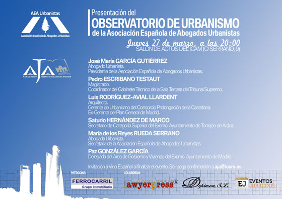 El Presidente de la Asociación Española de Abogados Urbanistas José María García Gutiérrez y el Presidente de la Agrupación de los Jóvenes Abogados de Madrid, Juan Gonzalo Ospina Serrano, han firmado un acuerdo de colaboración entre las dos entidades con el fin de estrechar los lazos y colaborar activamente llevando a cabo actividades y eventos conjuntos en beneficio de sus asociados. Los miembros de la Agrupación de Jóvenes Abogados de Madrid podrán beneficiarse de importantes descuentos en todos los cursos formativos que la Asociación de Abogados Urbanistas organiza cada año para mejorar los conocimientos de profesionales en una materia tan importante como es el Derecho Urbanístico, por ello, han organizado el “Curso de Aproximación al Derecho Urbanístico” que va ya por su doceava edición y que tendrá lugar los próximos días 1, 4, 8 y 11 de abril pudiendo disfrutar de un 20% de descuento todos los miembros de AJA-MADRID. Asimismo, se otorgarán becas de estudio completas a algunos jóvenes abogados. Igualmente a los asociados de la Agrupación de Jóvenes Abogados se les facilitará la asistencia a todos los actos, eventos y simposios que organiza la Asociación de Abogados Urbanistas muy comprometidos con el futuro de la abogacía. En el marco de este acuerdo, el próximo jueves 27 de marzo a las 20.00 horas en el Salón de Actos del Ilustre Colegio de Abogados de Madrid, tendrá lugar la presentación oficial del Observatorio del Urbanismo promovido por la Asociación Española de Abogados Urbanistas y que cuenta con la colaboración, entre otros, de reputados magistrados, técnicos de diversos ayuntamientos así como abogados especialistas en la materia, empresas del sector y arquitectos. El Observatorio analizará la evolución del sector urbanístico emitiendo notas, artículos e informes periódicos con el fin de dar a conocer las novedades más destacadas de un sector con tanto peso en la economía española como es el sector urbanístico.