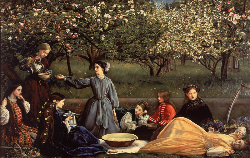Millais tardó cuatro primaveras en pintar el cuadro, realizado al aire libre en la mansión Bowerswell, la casa de sus suegros en Perth (Escocia). En el cuadro se representa a ocho mujeres jóvenes de distintas edades, holgazaneando en un jardín, al lado de un manzano, despreocupadas y felices. Se disponen a comerse un gran cuenco de natillas mientras que la única figura que está de pie, quizá la de mayor edad, sirve tazas de té que otra joven, de rodillas, va recogiendo para luego distribuirlas entre las que están sentadas o tumbadas. Las jóvenes del cuadro son miembros de la familia de Effie, la mujer de Millais. Alice, una de sus hermanas, está incluso pintada dos veces.