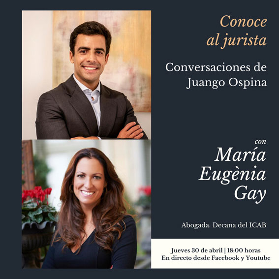 El jueves 30 de abril a las 18:00 horas tendrá lugar en directo a través de YouTube una charla entre la decana del Colegio de Abogados de Barcelona María Eugènia Gay y el abogado penalista Juan Gonzalo Ospina.