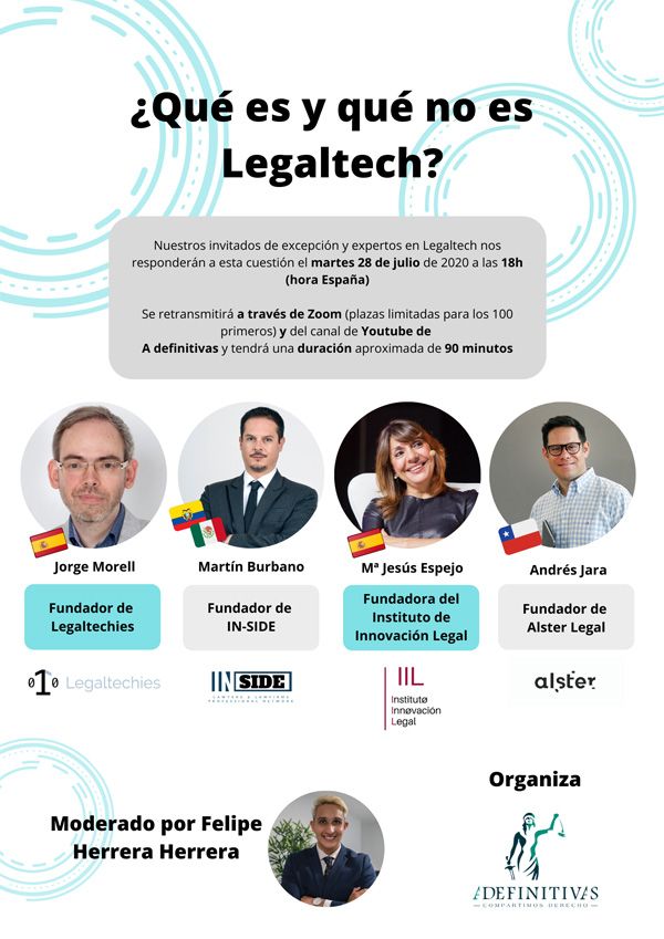 Para dar respuesta a qué es y qué no es Legaltech, contarán con 4 expertos en la materia Legaltech: Jorge Morell Ramos, fundador de Legaltechies, consultora especializada en servicios Legaltech para despachos, departamentos legales y facultades de Derecho, Maria Jesús Espejo, fundadora del Instituto de Innovación Legal, Andrés Jara, fundador de Alster Legal, empresa chilena de servicios y consultoría estratégica legal, para agilizar proyectos de negocios de compañías en el mercado latinoamericano y Martín Burbano, fundador de IN-SIDE plataforma digital que hace posible la digitalización del abogado y la comercialización de los Servicios Jurídicos.