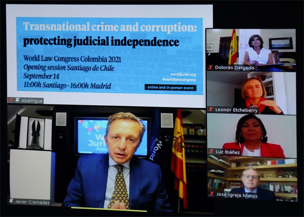 La Fiscal General de Estado, Dolores Delgado, ha participado esta tarde en la sesión de apertura previa al Congreso Mundial de Derecho Colombia 2021, bajo el nombre “Delincuencia Transnacional y Corrupción: Protección de la Independencia Judicial”, que se ha celebrado de forma virtual.