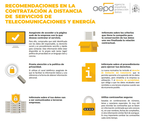 La Agencia Española de Protección de Datos (AEPD) ha publicado un ‘Plan de inspección de oficio sobre contratación a distancia en operadores de telecomunicaciones y comercializadores de energía’ en el que analiza los tratamientos de datos en estos sectores y su adecuación a la normativa de protección de datos desde la perspectiva de la acreditación de la identidad del contratante y de los servicios contratados.