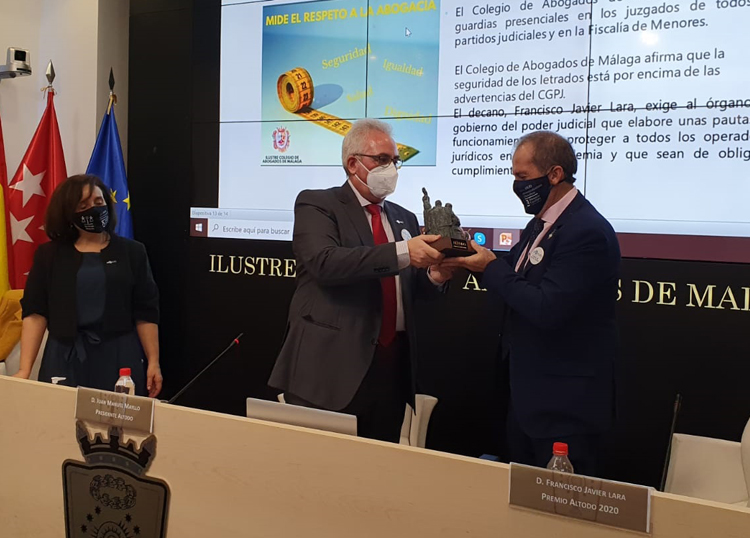 El pasado 18 de diciembre de 2020, tuvo lugar la ceremonia de entrega del IV Premio Anual ALTODO, concedido en esta ocasión a quien hasta fecha reciente fuera Decano del Ilustre Colegio de Abogados de Málaga, Francisco Javier Lara Peláez. La expresión física del premio consiste en una estatuilla de bronce, diseñada por José Luis Fernández, diseñador también de la conocida estatuilla de los Premios Goya, que simboliza a cuatro abogados de oficio provistos de sus togas, abrazados en círculo y con el brazo de uno de ellos elevándose hacia el cielo.