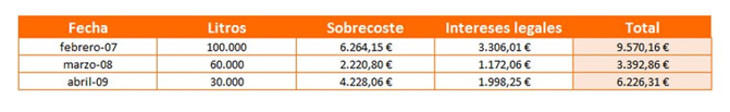 En la siguiente tabla encontrarás varios ejemplos del importe que podría reclamar judicialmente un perjudicado que hubiese pagado un sobreprecio en un mes determinado del período comprendido entre los años 2007 y 2020; importe que además se ve incrementado por los intereses: