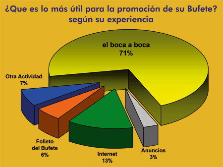 El 71 % de los abogados españoles confía en la eficacia del boca a boca para promocionar su bufete, según la encuesta realizada por el portal lawyerpress.com entre más de 200 abogados españoles. Otras formas de promoción como Internet o publicidad convencional son herramientas que sólo lo utilizan una minoría. La encuesta online se ha realizado en los meses de noviembre y diciembre del 2006 a través del portal de Marketing y Comunicación para Abogados www.lawyerpress.com. El portal de Marketing y Comunicación para Abogados, www.lawyerpress.com, realizó en su página de inicio la pregunta “¿Que es lo más útil para la promoción de su Bufete, según su experiencia?” y ofreció cinco repuestas alternativas, como el Boca a Boca, Internet, el folleto del bufete, la publicidad mediante anuncios o otras actividades. El 71 % de los más de 200 respuestas se decantó por el Boca a Boca, mientras el 13 % apostaba por Internet, un 7 % por otras actividades, un 6 % por el folleto del bufete, y un 3 % confiaba en los anuncios como medio de promoción.