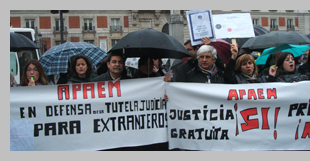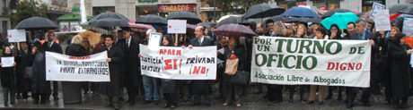 La larga serie de protestas de los abogados adscritos al turno de oficio en Madrid ha visto ayer la primera manifestación pública de un nutrido grupo de más de 300 abogados frente a la sede del Gobierno regional de la Comunidad de Madrid. A pesar de la lluvia, los manifestantes protestaron durante casi una hora reivindicando el pago de las más de 24 millones de Euros que la Comunidad de Madrid adeuda a los abogados del turno de oficio. El Consejero de Presidencia, Justicia e Interior, Francisco Granados había prometido al decano del Colegio de Abogados de Madrid, el abono inmediato de éstas cantidades. Con coros como “¡Espe, escucha, el Turno de Oficio lucha!" refiriéndose a la presidenta de la Comunidad de Madrid, o con lemas como “Este oficio tiene beneficio” los abogados convocados por la Asociación Profesional de Abogados de Extranjeros de Madrid (APAEM), la Asociación de Letrados por un Turno de Oficio Digno (ALTODO) y la Asociación Libre de Abogados (ALA) espresaron su rechazo a la privatización del turno de oficio. Los abogados de Madrid no son los únicos en denunciar una posible privatización del turno de oficio. Tanto en Valencia como en Gijón o en A Coruña los abogados adscritos a los diferentes turnos de oficio están en pie de guerra para que los diferentes gobiernos autonómicos abonen dentro de los plazos establecidos las cantidades que perciben por su servicio.