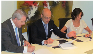 El presidente del Instituto Superior de Derecho y Economía (ISDE), Alejandro Pintó; la directora general de la Fundación Estudiantes, María Luisa González-Bueno y el socio director de Gómez-Acebo & Pombo, Manuel Martín, han firmado esta mañana el acuerdo que permitirá poner en marcha el primer Máster en Derecho y Gestión del Deporte ISDE-Fundación Estudiantes.