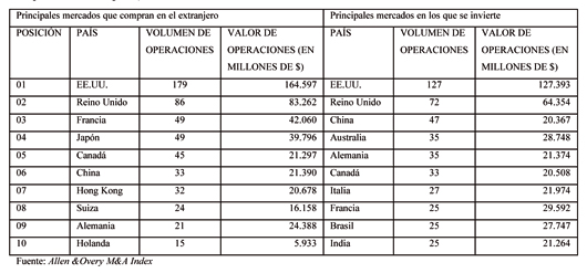 España mantiene su posición en la clasificación de los 20 primeros países más activos en el mercado de Fusiones y Adquisiciones (M&A), de acuerdo con el último informe de M&A de Allen & Overy” (Allen & Overy M&A Index). En línea con el descenso de la actividad mundial, España ha experimentado una disminución tanto en el volumen como en el valor de la actividad de M&A en comparación con el año pasado, con un descenso de valor del 71% (de 37.716 millones de dólares en 2010 a 10.780 millones de dólares en 2011) y un descenso de volumen del 39% en la actividad de M&A en el extranjero (de 18 operaciones en 2010 a 11 operaciones en 2011). El último informe de M&A de Allen & Overy prevé que la crisis de la deuda que están sufriendo los gobiernos europeos podría derivar en un aumento de la actividad de M&A, ya que existen empresas fuera de la Eurozona que están buscando oportunidades a bajo precio. El informe destaca en qué medida los distintos países han empezado a estar presentes en unos y otros mercados, en tanto las empresas buscan nuevas oportunidades para crecer. España se mantiene como un vendedor en el extranjero, en línea con otros países de Europa Occidental, como Alemania. En el año 2011, España aparece como un mercado clave en el que realizar adquisiciones, para dos de los diez primeros compradores como son el Reino Unido (5 adquisiciones en España) y Suiza (1 adquisición en España). Uno de los factores que se espera que genere actividad en Europa, en un futuro próximo, es la venta anticipada de activos estatales para reducir los niveles de déficit. Allen &Overy, como parte de un estudio mundial más amplio sobre cambios en los factores que influyen en la economía, también ha realizado una entrevista a 1.000 de los principales empresarios de todo el mundo sobre sus planes de crecimiento. Los resultados muestran que los líderes empresariales europeos todavía están centrados en crecer, a pesar de la constante volatilidad del mercado. Casi la mitad de los entrevistados (43%) esperan hacer operaciones de M&A para poder llevar a cabo, al menos, parte de sus planes de crecimiento, mientras otro 35% confía en el crecimiento orgánico como forma para impulsar parte de su expansión. Un 17% de las empresas de todo el mundo no planea crecer, frente al 23% de los empresarios europeos que no tienen previsto expandirse en los próximos 2-3 años. El "M&A Index" contiene opiniones y comentarios de socios de Allen & Overy sobre el mercado, basados en un estudio trimestral, realizado por agentes independientes, sobre el volumen y el valor de las operaciones mundiales de M&A (valor declarado de +100m$). Asimismo, el informe identifica qué países son “compradores netos” fuera de su territorio y cuáles son “vendedores netos” de activos. •China, Rusia y la India figuran en la lista de los 20 primeros países del mundo que realizan adquisiciones en el extranjero, con 33, 12 y 10 adquisiciones internacionales, respectivamente. Sin embargo, una señal de que todavía tienen que hacer un verdadero esfuerzo como compradores en operaciones de M&A, es que se les considera “vendedores netos” fuera de su territorio: China con 14 operaciones, la India con 15 y Rusia con 2. •EE.UU. sigue siendo el país que más compra fuera de su territorio, con un balance de más de 52 operaciones en lo que llevamos de año. Para los compradores estadounidenses, los principales mercados se encuentran en el Reino Unido (39 adquisiciones), Canadá (18), Alemania (15), Francia (12) y Australia (9), figurando también en la lista de los diez primeros, India, China y Brasil. •Los países con mayor crecimiento en cuanto a M&A en el extranjero son Japón y China. China, que el año 2007 ocupó el decimoctavo lugar en la lista de compradores más activos fuera de su territorio, ahora ocupa el sexto, y Japón ha escalado del decimotercero al cuarto puesto.