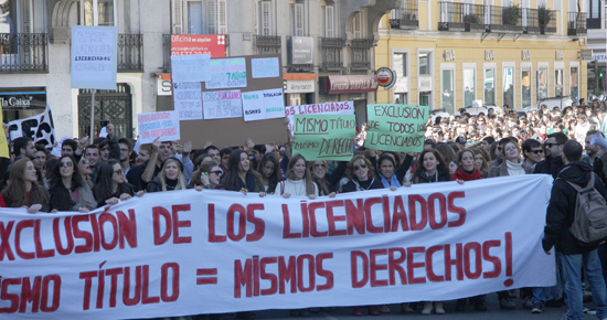 Las pancartas de la cabecera rezaban "Exclusión de los licenciados. ¡Mismo título es igual a mismos derechos!" y "Este master chapucero nos roba nuestro dinero" y los cánticos que no cesaban durante todo el recorrido pidiendo soluciones al ministro de Justicia, Alberto Ruiz-Gallardón, a quien acusaban de no cumplir sus promesas.