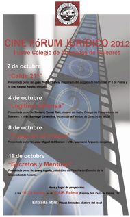El Ilustre Colegio de Abogados de Baleares ha organizado un nuevo ciclo de Cine Fórum Jurídico, con la finalidad principal de ampliar y diversificar las oportunidades para el análisis y la reflexión sobre cuestiones relacionadas con el mundo del derecho, a través, en este caso, de la gran pantalla. El ciclo, de entrada libre, tendrá lugar los días 2, 4, 8 y 11 de octubre, a las 18:30 horas, en la sede palmesana del ICAIB (Rambla dels Ducs de Palma, 10). La idea es llevar a cabo un debate o coloquio sobre los temas centrales de las cuatro películas seleccionadas, que serán presentadas por distintos operadores jurídicos. En concreto, se proyectarán las siguientes películas: Día 2 de octubre: “Celda 211”, presentada por el Sr. Juan Pedro Yllanes, magistrado del Juzgado de Instrucción nº 8 de Palma y la Sra. Raquel Aguiló, abogada. Día 4 de octubre: “Legítima defensa”, presentada por el Sr. Frederic Xavier Ruiz, decano del Ilustre Colegio de Procuradores de Baleares, y el Sr. Santiago Cavanillas, decano de la Facultad de Derecho de la UIB. Día 8 de octubre: “Fuego en el cuerpo”, presentada por el Sr. José Miguel del Campo y el Sr. Laureano Arquero, abogados. Día 11 de octubre: “Secretos y Mentiras”, presentada por el Sr. Josep Aguiló, catedrático de Filosofía del Derecho de la Universidad de Alicante. Las plazas están limitadas al aforo del local.