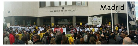 Más de 25.000 abogados han protestado este miércoles 20 de noviembre a las 12:00 horas ante las sedes judiciales o colegiales de toda España en respuesta a las concentraciones convocadas por el Consejo General de la Abogacía Española, los Consejos Autonómicos y los Colegios de Abogados para manifestar el rechazo de todos los sectores jurídicos a la Ley 10/2012 que establece las Tasas Judiciales, justo cuando se cumple un año de su aprobación. La finalidad de estas concentraciones ha sido informar como abogados a la ciudadanía de la gravedad y perniciosa incidencia de esta ley, pues la limitación del acceso a la justicia supone no sólo una vulneración del derecho fundamental a la tutela judicial efectiva, sino también una restricción para exigir y hacer valer todos los demás derechos: limitar el acceso a la Justicia vulnera el derecho a la tutela judicial efectiva y supone una restricción para exigir los demás derechos. Entre los lemas que se difundieron en las múltiples concentraciones cabe destacar el que presidió la manifestación ante los juzgados de Plaza Castilla, en Madrid, que se desarrolló bajo el lema ‘Justicia para Todos. Un año contra las tasas’. La concentración de Madrid, a la que asistieron cerca de 1.000 personas, estuvo encabezada por el presidente del Consejo General de la Abogacía Española, Carlos Carnicer, y la decana del Colegio de Abogados de Madrid, Sonia Gumpert. También contó con la presencia del juez decano de Madrid, José Luis González Armengol, y el portavoz de la asociación Jueces para la Democracia, Joaquím Bosch Las concentraciones celebradas ante todas las sedes judiciales y colegiales de toda España contaron, además de la asistencia de abogados, con la presencia de jueces, fiscales, secretarios judiciales, sindicatos, funcionarios, ciudadanos y representantes de las asociaciones de consumidores, destacando la ausencia de representantes de los procuradores y graduados sociales. En todas las concentraciones se ha leído el Manifiesto Social ‘Un Año contra las Tasas’ presentado ayer por la Plataforma Justicia para Todos con miembros de la Interasociativa de Jueces y Fiscales y representantes de secretarios judiciales, sindicatos y de asociaciones de consumidores.