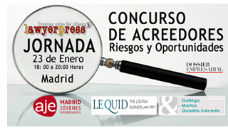 Intervienen abogados expertos en temas concursales procedentes de los bufetes Gallego Martos & Quadra-Salcedo y LeQuid El próximo jueves 23 de enero se darán cita en la Asociación de los Jóvenes Empresarios de Madrid (AJE) abogados especializados en derecho concursal para analizar diversas cuestiones sobre el tema y generar un debate posterior. En esta jornada se examinará la responsabilidad de los administradores y directivos en el proceso concursal; las ventajas el concurso de acreedores y por último, la refinanciación de la deuda y los escudos protectores. Del despacho Gallego Martos & Quadra-Salcedo acudirán como ponentes los socios Rodrigo Martos y Javier Gallego. El primero analizará el presupuesto objetivo del concurso de acreedores, las soluciones al mismo y los elementos objetivos potencialmente generadores de responsabilidad en los Administradores o Directivos de la empresa; y el segundo de los socios, expondrá la naturaleza y características de los acuerdos de refinanciación preconcursales a los que la Ley Concursal otorga una serie de escudos protectores frente al eventual posible futuro concurso de acreedores, así como la prórroga que la Ley Concursal prevé para la negociación de los mismos y sus efectos. Por su parte, Jose Maria Dutilh, Socio director de LeQuid, responsable de fusiones, adquisiciones y reestructuraciones, en una primera ponencia describirá los efectos protectores del concurso de acreedores frente a reclamaciones, ejecuciones y embargos, la paralización del devengo de intereses de las deudas contraídas y las posibilidades de reducir deudas y/o aplazarlas. Y para finalizar, planteará la adquisición y/o transmisión de Empresas o Unidades Productivas aprovechando la Ley Concursal. “La Jornada en colaboración con la Asociación de Jóvenes Empresarios pretende como las otras iniciativas que Lawyerpress ha puesto en marcha, acercar a los despachos directamente a posibles clientes y establecer un contacto de tu a tu,” comenta Carlos R. Adeva sobre la Jornada que forma parte de un ambicioso calendario de eventos organizada por la consultora Lawyerpress.
