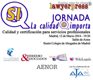 • Intervienen todos los agentes protagonistas en el desarrollo de la certificación tanto para analizar los pasos que conlleva el proceso como para exponer las ventajas de conseguir el sello Mañana miércoles 12 de marzo a las 19:30 horas se darán cita en el salón de actos del Ilustre Colegio de Abogados de Madrid expertos en el proceso de Certificación de Calidad. Por un lado se detallarán las condiciones que deberían tener los despachos para estar certificados por parte de David Velasco Cotell, Auditor Jefe de AENOR; y por otro, Domingo Gaitero Gordillo, Asociado de InnoSIB Consultores, aportará la visión práctica del proceso. Asimismo, Marylin Delgado, analizará las ventajas de utilizar una herramienta como WikiLegals para favorecer la gestión interna del despacho, a través de su servicio online de avisos de notificaciones judiciales y recordatorios de actuaciones, entre otras labores. Por último, nos describirán su propia experiencia en este proceso de certificación Carmen Herrero, Abogada Gerente de Lexunión y Paz Martin, Abogada y Responsable de Nuevas Tecnologías y calidad de Herrero & Asociados. Esta jornada de Calidad se encuadra dentro de un ambicioso calendario de eventos organizado por Lawyerpress, donde el ámbito de la certificación tiene un papel fundamental debido a que “la calidad es una buena herramienta de marketing para los despachos de abogados que se quieren diferenciar”, comenta Carlos R. Adeva, Responsable de Desarrollo de Negocio de Lawyerpress. Además, añade “esta jornada pretende explicar de manera muy práctica el proceso y las ventajas de la certificación porque hemos detectado un cierto temor en sector legal frente a éstas herramientas ya muy comunes en otros sectores de servicios.”
