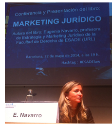 El 22 de mayo tuvo lugar en Barcelona la presentación en la Platea de la Facultad de Derecho de ESADE del libro de Eugenia Navarro, Marketing Jurídico profesora de Estrategia y Marketing Jurídico de la Facultad de Derecho de ESADE (URL) y consultor internacional en la materia. El decano Eduardo Berché presentó el acto haciendo referencia " al lujo" que suponía para el centro contar en su claustro a la profesora Navarro y centro su intervención en recordar que para el abogado del siglo XXI ya no era suficiente tener una excelente preparación técnica en Derecho ya que le mercado exigía otras competencias de gestión, de relación intercultural o comerciales, destacando el aprendizaje del marketing y poniendo como ejemplo el trabajo de Eugenia Navarro. Precedieron a la exposición de la autora Rafael Jiménez- Gusi, socio de Baker & McKenzie y miembro del Nominating Committee, que compartió con los presentes como la internacional despacho había impulsado su actividad a través del trabajo en marketing iniciado por Eugenia Navarro en el despacho, el profesor Enric Bartlet, exdecano de la Facultad de Derecho de ESADE, ala sazón prologuista del libro, que se centro en la importancia de interiorizar en los estudiantes de Derecho y en los profesionales jurídicos que materias como el marketing ya son indispensables para dedicarse al negocio legal y la editora de Tirant lo Blanch, que agradeciendo la generosidad de Eugenia Navarro en su trabajo reafirmo el compromiso de Tirant y su politica editorial con la innovación y la calidad. Eugenia Navarro cerró el acto, al que acudieron un centenar de los más significados profesionales y despachos de referencia en el Derecho de los Negocios en España agradeciendo la confianza depositada en su pionero trabajo por los despachos, por ESADE y por la editorial Tirant lo Blanch y la ayuda de su familia y compañeros. La profesora insistió en la dimensión útil, práctica y fácilmente interiorizable para los abogados de su obra alejada de dogmatismos teóricos o elementos accesorios y anunciando la continuidad del trabajo iniciado con su obra Marketing Jurídico Para acceder a la obra pinche en la portada del libro