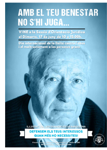 El Colegio de Abogados de Barcelona organiza con motivo del 'Día mundial de la toma de consciencia del abuso y maltrato a la vejez’, una Servicio de asesoramiento exclusivo y gratuito para este colectivo. Bajo el lema 'Di basta al maltrato, habla con un abogado', letrados voluntarios de la Comisión de los Derechos de las Personas Mayores responderán las consultas jurídicas de las personas mayores que se acerquen hoy martes 17 de junio, de 10 a 13h, a la sede del ICAB. La Comisión de los Derechos de las Personas Mayores del Colegio de Abogados de Barcelona organiza una rueda de prensa, hoy, 17 de junio, a las 11h, con motivo del 'Día mundial de la toma de consciencia del abuso y maltrato a la vejez’" para dar a conocer las situaciones en que una persona mayor sufre abuso, y en qué ámbitos ha habido un incremento más importante. El acto estará presidido por la vicedecana del Colegio de Abogados de Barcelona, Rosa Mª Barberà, y contará con la asistencia de la ‘Síndica de Greuges’ de Barcelona, Mª. Assumpció Vilà, de la presidenta del Colegio de Trabajo Social, Núria Carrera, de la presidenta la Asociación para la investigación del maltrato a las personas mayores, (EIMA), Mercé Tabueña; del director general de la Asociación “Amics de la Gent Gran” (Amigos de las personas mayores), Oriol Alsina, y del miembro de la Junta de la Federación de Asociaciones de Mayores (FATEC), Enrique Peidró. Ante la vulnerabilidad de un colectivo que considera en muchos casos "un tabú" abordar estas situaciones, el Colegio de Abogados de Barcelona ofrecerá bajo el lema "Di basta al maltrato, habla con un abogado” un Servicio de orientación jurídica exclusivo y gratuito para personas mayores, prestado por abogados voluntarios de la Comisión de los Derechos de las Personas Mayores. El asesoramiento se realizará el martes 17 de junio, 10 a 13, en la sede del Colegio de Abogados de Barcelona (Mallorca 283).