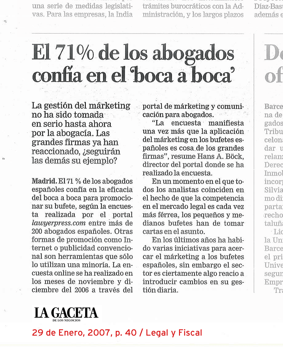 copyright, 2009 - Strong Element, S.L. - Peña Sacra 18 - E-28260 Galapagar - Madrid - Spain - Tel.: + 34 91 858 75 55 - Fax: + 34 91 858 56 97 - info@lawyerpress.com - www.lawyerpress.com - Aviso legal |